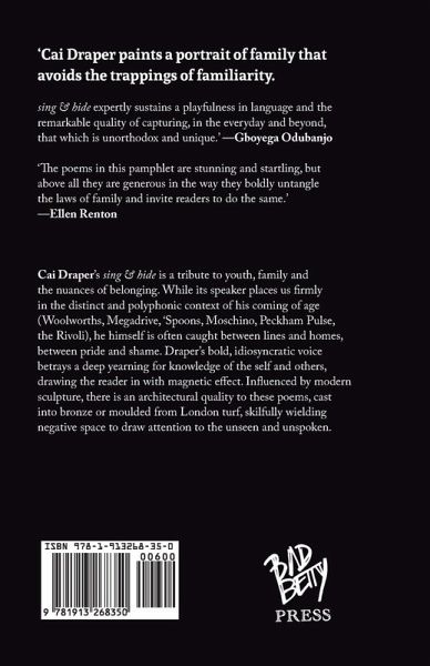 Cai Draper's sing & hide is a tribute to youth, family and the nuances of belonging. While its speaker places us firmly in the distinct and polyphonic context of his coming of age (Woolworths, Megadrive, 'Spoons, Moschino, Peckham Pulse, the Rivoli), he himself is often caught between lines and homes, between pride and shame. Draper's bold, idiosyncratic voice betrays a deep yearning for knowledge of the self and others, drawing the reader in with magnetic effect. Influenced by modern sculpture, there is an architectural quality to these poems, cast into bronze or moulded from London turf, skilfully wielding negative space to draw attention to the unseen and unspoken.