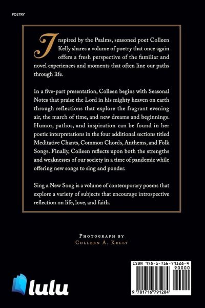 nspired by the Psalms, seasoned poet Colleen Kelly shares a volume of poetry that once again offers a fresh perspective of the familiar and novel experiences and moments that often line our paths through life. In a five-part presentation, Colleen begins with Seasonal Notes that praise the Lord in his mighty heaven on earth through reflections that explore the fragrant evening air, the march of time, and new dreams and beginnings. Humor, pathos, and inspiration can be found in her poetic interpretations in the four additional sections titled Meditative Chants, Common Chords, Anthems, and Folk Songs. Finally, Colleen reflects upon both the strengths and weaknesses of our society in a time of pandemic while offering new songs to sing and ponder. Sing a New Song is a volume of contemporary poems that explore a variety of subjects that encourage introspective reflection on life, love, and faith.
