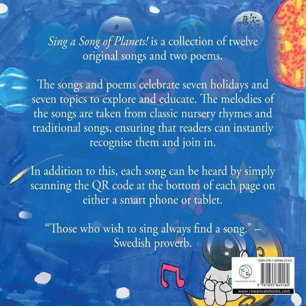 Sing a Song of Planets! is a collection of twelve original songs and two poems. The songs and poems celebrate seven holidays and seven topics to explore and educate. The melodies of the songs are taken from classic nursery rhymes and traditional songs, ensuring that readers can instantly recognise them and join in. In addition to this, each song can be heard by simply scanning the QR code at the bottom of each page on either a smart phone or tablet. "Those who wish to sing always find a song." - Swedish proverb.