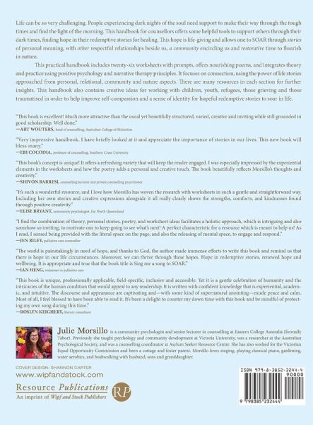 Life can be so very challenging. People experiencing dark nights of the soul need support to make their way through the tough times and find the light of the morning. This handbook for counsellors offers some helpful tools to support others through their dark times, finding hope in their redemptive stories for healing. This hope is life-giving and allows one to SOAR through stories of personal meaning, with other respectful relationships beside us, a community encircling us and restorative time to flourish in nature. This practical handbook includes twenty-six worksheets with prompts, offers nourishing poems, and integrates theory and practice using positive psychology and narrative therapy principles. It focuses on connection, using the power of life stories approached from personal, relational, community and nature aspects. There are many resources in each section for further insights. This handbook also contains creative ideas for working with children, youth, refugees, those grieving and those traumatized in order to help improve self-compassion and a sense of identity for hopeful redemptive stories to soar in life.