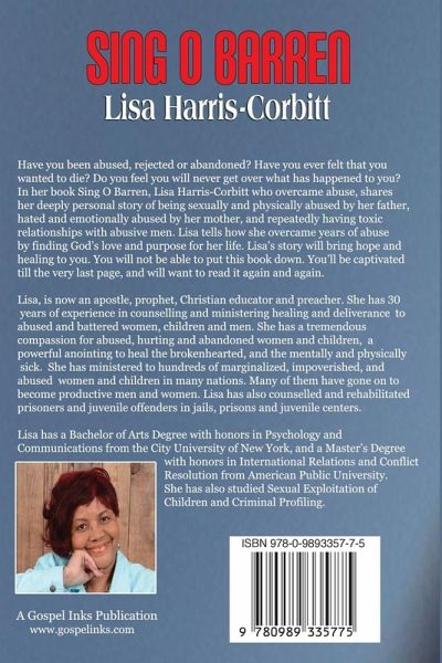 Have you been abused, rejected or abandoned? Have you ever felt that you wanted to die? Do you feel you will never get over what has happened to you? In her book Sing O Barren, Lisa Harris-Corbitt who overcame abuse, shares her deeply personal story of being sexually and physically abused by her father, hated and emotionally abused by her mother, and repeatedly having toxic relationships with abusive men. Lisa tells how she overcame years of abuse by finding God’s love and purpose for her life. Lisa’s story will bring hope and healing to you. You will not be able to put this book down. You’ll be captivated till the very last page, and will want to read it again and again.
