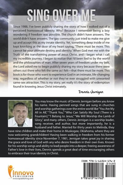 ABOUT SING OVER ME by Dennis Jernigan: Since 1988, I've been publicly sharing the story of how I walked out of a perceived homosexual identity. Why? Because I remember being a boy wondering if freedom was possible. The church didn't have answers. The world didn't have answers. The gay community just tried to make me give up and accept this as my innate identity. Yet, something deep inside of me kept knocking at the door of my heart saying, "There must be more. This cannot be your ultimate destiny and identity." When God met me with the Truth of the transforming power of Jesus Christ, and I began what I call my incredible journey, I began to realize that I'd been lied to by the world and the philosophies of man. After seven years of freedom under my belt, the Lord asked me to begin publicly sharing my story because there were others out there who felt the same as I felt--that there must be more. This book is for those who want to experience God in an intimate, life-changing way, regardless of whether or not they've ever struggled with unwanted same-sex attraction. This is my story, yet really it's the story of redemption found in knowing Jesus Christ intimately. --Dennis Jernigan If you have read Gay Girl, Good God: The Story of Who I Was, and Who God Has Always Been by Jackie Hill Perry, or God and the Gay Christian: The Biblical Case in Support of Same-Sex Relationships by Matthew Vines, or UnClobber: Rethinking Our Misuse of the Bible on Homosexuality by Colby Martin--you will want to read Sing Over Me by Dennis Jernigan. **** ABOUT DENNIS JERNIGAN: You may know the music of Dennis Jernigan before you know his name. Having penned songs that are sung in churches and worship gatherings over the entire world like "You Are My All in All," "Thank You," "Who Can Satisfy My Soul (There is a Fountain)," "I Belong to Jesus," "We Will Worship the Lamb of Glory," and many others, Dennis Jernigan is a worship leader, song receiver, and author, but more importantly, he is a husband and father. Married for thirty years to Melinda, they have nine children and make their home in Muskogee, Oklahoma, where they are now welcoming grandchildren! Having been walking in freedom from his former homosexual identity since November 7, 1981, Jernigan takes great joy in sharing the grace and love of God with any who desire freedom in their own lives. Known for his worship songs and ability to lead people into a deeper, freeing awareness of Father's love in their lives, Dennis spends a great deal of time encouraging others to embrace their true identity in Christ.