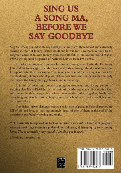 Sing Us A Song Ma, Before We Say Goodbye is a lively, vividly rendered and extremely moving memoir of Johnny Slater's childhood in war-torn Liverpool. Written by his daughter Carol, it follows Johnny from the outbreak of the Second World War in 1939, right up until his period of National Service from 1954-1956. It tracks the progress of Johnny, his brother Jimmy, sister Cath, Ma, Da, Aunty Julia and his four-legged friends, Punch and Judy - through the devastation of the Liverpool Blitz, their evacuation to a country farm (and the first sight of cows for the children), Johnny's school years, D-Day, first love, and the devastating tragedy that befalls the family during Johnny's time in the army. It is full of detail and colour, painting an exuberant and loving picture of working class life in Kirkdale, on the banks of the Mersey, where life was often hard and money in short supply, but where communities pulled together, family was everything and it only took a chippy dinner or a bonfire to send a small boy into paroxysms of joy. The dialect-driven dialogue creates a rich sense of place, and the characters are full of life and love, so that the untimely death of one of them at the end of the narrative is profoundly moving and tragic.