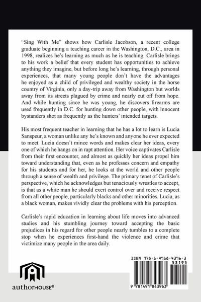 "Sing With Me" shows how Carlisle Jacobson, a recent college graduate beginning a teaching career in the Washington, D.C., area in 1998, realizes he's learning as much as he is teaching. Carlisle brings to his work a belief that every student must, without a doubt have opportunities to achieve anything they imagine, but before long he's learning, through personal experiences, that many young people don't have the advantages he enjoyed as a child of privileged and wealthy society in the horse country of Virginia, only a day-trip away from Washington but worlds away from its streets plagued by crime and nearly cut off from hope. And while Carlisle has enjoyed hunting since he was young, he discovers firearms are used frequently in D.C. for hunting down other people, with innocent bystanders shot as frequently as the hunters' intended targets. His most frequent teacher in learning that he has a lot to learn is Lucia Sanspeur, a woman unlike any he's known and anyone he ever expected to meet. Lucia doesn't mince words and makes clear her ideas, every one of which he hangs on in rapt attention. Her voice captivates Carlisle from their first encounter, and almost as quickly her ideas propel him toward understanding that, even as he professes concern and empathy for his students and for her, he looks at the world and other people through a sense of wealth and privilege. The primary tenet of Carlisle's perspective, which he acknowledges but tenaciously wrestles to accept, is that as a white man he should exert control over and receive respect from all other people, particularly blacks and other minorities. Lucia, as a black woman, makes vividly clear the problems with his perception. Carlisle's rapid education in learning about life moves into advanced studies and his stumbling journey toward accepting the basic prejudices in his regard for other people nearly tumbles to a complete stop when he experiences first-hand the violence and crime that victimize many people in the area daily.