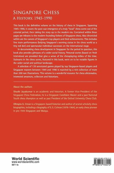This book is the definitive volume on the history of chess in Singapore. Covering 1945–1990, it covers the post-war emergence of a truly "local" chess scene out of the colonial period, then taking the story up to the modern era. Contained within these pages are tributes to the modern founding fathers of Singapore chess. Also chronicled within are the careers of Singapore's top players and their achievements. This includes fine team performances (belying Singapore's seeming status in the chess world as a tiny red dot) and spectacular individual successes on the international stage. In documenting chess development in Singapore for the period in question, this book also provides glimpses of a wider social history. Personal stories (based on fresh interviews) are provided that give a sense of the chessplaying milieu of the time. Stalwarts in the chess scene, featured in this book, went on to be notable figures in the wider social and political landscape. A selection of 139 annotated games played by top Singapore-based players and Singapore masters between 1949 and 1990 is matched by a rich collection of more than 200 rare illustrations. This volume is a wonderful resource for chess aficionados, interested amateurs, collectors and historians.