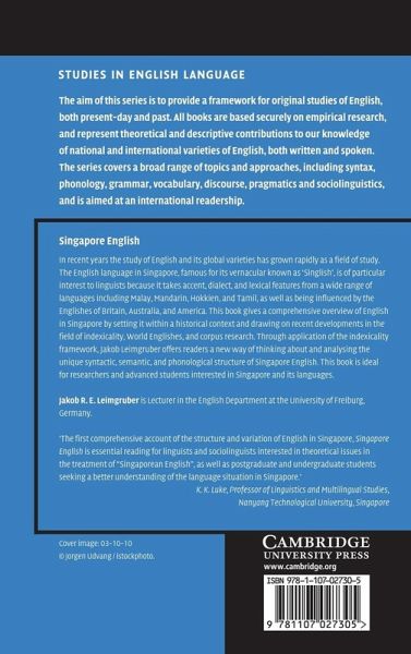 In recent years the study of English and its global varieties has grown rapidly as a field of study. The English language in Singapore, famous for its vernacular known as 'Singlish', is of particular interest to linguists because it takes accent, dialect and lexical features from a wide range of languages including Malay, Mandarin, Hokkien and Tamil, as well as being influenced by the Englishes of Britain, Australia and America. This book gives a comprehensive overview of English in Singapore by setting it within a historical context and drawing on recent developments in the field of indexicality, world Englishes and corpus research. Through application of the indexicality framework Jakob Leimgruber offers readers a new way of thinking about and analysing the unique syntactic, semantic and phonological structure of Singapore English. This book is ideal for researchers and advanced students interested in Singapore and its languages.