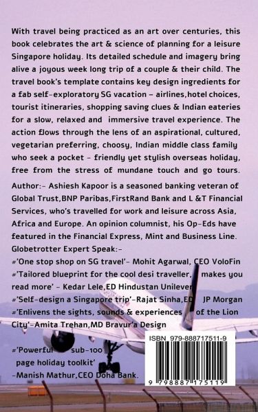 With travel being practiced as an art over centuries, this book celebrates the art & science of planning for a leisure Singapore holiday. Its detailed schedule and imagery bring alive a joyous week long trip of a couple & their child.The travel book’s template contains key design ingredients for a fab self-exploratory SG vacation – airlines, hotel choices, tourist itineraries, shopping saving clues & Indian eateries for a slow, relaxed and immersive travel experience.The action flows through the lens of an aspirational, cultured, vegetarian preferring, choosy, Indian middle class family who seek a pocket - friendly yet stylish overseas holiday, free from the stress of mundane touch and go tours.