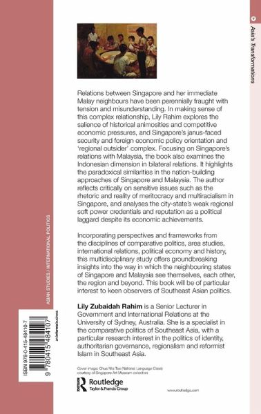 Relations between Singapore and her immediate Malay neighbours have been perennially fraught with tension and misunderstanding. In making sense of this complex relationship, Lily Rahim explores the salience of historical animosities and competitive economic pressures, and Singapore's janus-faced security and foreign economic policy orientation and 'regional outsider' complex. Focusing on Singapore's relations with Malaysia, the book also examines the Indonesian dimension in bilateral relations. It highlights the paradoxical similarities in the nation-building approaches of Singapore and Malaysia. The author reflects critically on sensitive issues such as the rhetoric and reality of meritocracy and multiracialism in Singapore, and analyses the city-state's weak regional soft power credentials and reputation as a political laggard despite its economic achievements. Incorporating perspectives and frameworks from the disciplines of comparative politics, area studies, international relations, political economy and history, this multidisciplinary study offers groundbreaking insights into the way in which the neighboring states of Singapore and Malaysia see themselves, each other, the region and beyond. This book will be of particular interest to keen observers of Southeast Asian politics.