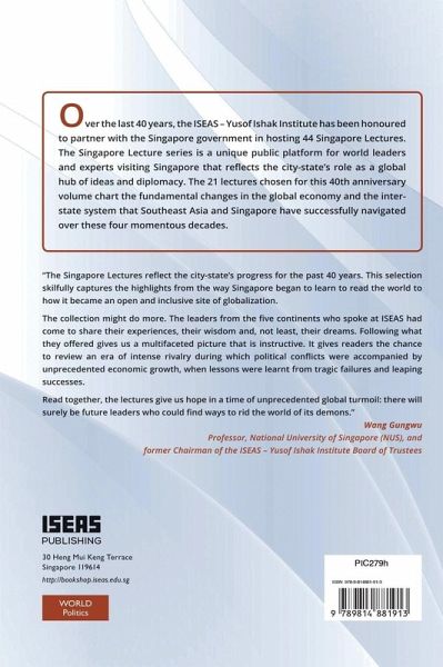 Over the last 40 years, the ISEAS - Yusof Ishak Institute has been honoured to partner with the Singapore government in hosting 44 Singapore Lectures. The Singapore Lecture series is a unique public platform for world leaders and experts visiting Singapore that reflects the city-state's role as a global hub of ideas and diplomacy. The 21 lectures chosen for this 40th anniversary volume chart the fundamental changes in the global economy and the inter-state system that Southeast Asia and Singapore have successfully navigated over these four momentous decades. "The Singapore Lectures reflect the city-state's progress for the past forty years. This selection skilfully captures the highlights from the way Singapore began to learn to read the world to how it became an open and inclusive site of globalization. The collection might do more. The leaders from the five continents who spoke at ISEAS had come to share their experiences, their wisdom and, not least, their dreams. Following what they offered gives us a multifaceted picture that is instructive. It gives readers the chance to review an era of intense rivalry during which political conflicts were accompanied by unprecedented economic growth, when lessons were learnt from tragic failures and leaping successes. Read together, the lectures give us hope in a time of unprecedented global turmoil: there will surely be future leaders who could find ways to rid the world of its demons."--Wang Gungwu, Professor, National University of Singapore (NUS), and former Chairman of the ISEAS - Yusof Ishak Institute Board of Trustees