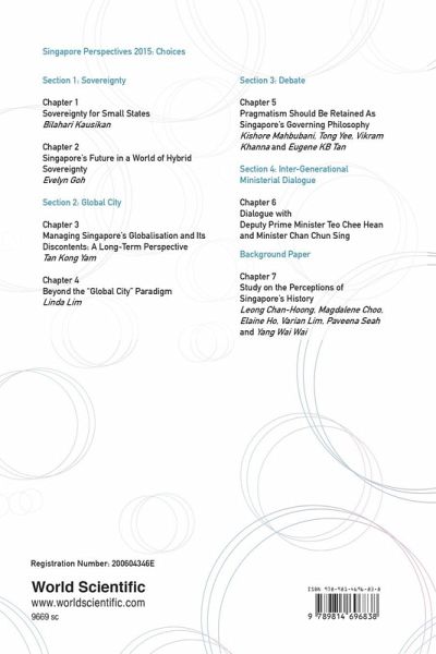 Singapore reaches an important milestone in its national development in 2015 when it celebrates its 50th year of independence. It has earned many accolades for the progress it has made in governance, the economy and societal development. However, with changing demographics, resource constraints and the emergence of regional competitors, Singapore's future is fraught with uncertainty. The book is a collection of papers presented at Singapore Perspectives 2015 by leading thought leaders and eminent speakers, reflecting on the critical decisions made in Singapore's past so as to envision strategic paths that the country should take in the future. The contributors include experts in their fields: Ambassador Bilahari Kausikan, Professor Evelyn Goh, Professor Tan Kong Yam, Professor Linda Lim, Professor Kishore Mahbubani, Tong Yee, Vikram Khanna and Associate Professor Eugene Tan. The inter-generational dialogue session with Deputy Prime Minister Teo Chee Hean and Minister in the Prime Minister's Office and Secretary-General of the National Trades Union Congress Chan Chun Sing carries the central theme of looking at the choices Singapore made in the past and the choices that have to be made moving forward. In line with reflecting on Singapore's past, the book will include a full report on a survey of 1,500 Singaporeans' perceptions of 50 historical events from independence to now.