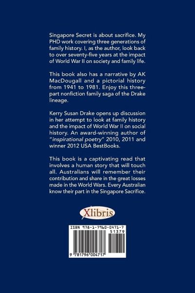 Singapore Secret is about sacrifice. My PHD work covering three generations of family history. I, as the author, look back to over seventy-five years at the impact of World War II on society and family life. This book also has a narrative by AK MacDougall and a pictorial history from 1941 to 1981. Enjoy this threepart nonfiction family saga of the Drake lineage. Kerry Susan Drake opens up discussion in her attempt to look at family history and the impact of World War II on social history. An award-winning author of "inspirational poetry" 2010, 2011 and winner 2012 USA BestBooks. This book is a captivating read that involves a human story that will touch all. Australians will remember their contribution and share in the great losses made in the World Wars. Every Australian know their part in the Singapore Sacrifice.