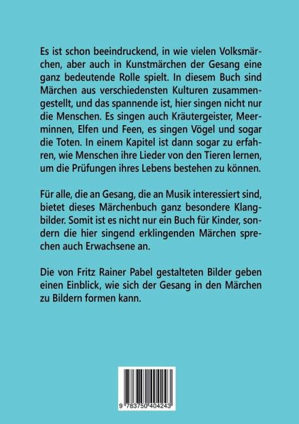 Es ist schon beeindruckend, in wie vielen Volksmärchen aber auch in Kunstmärchen der Gesang eine ganz bedeutende Rolle spielt. In diesem Buch sind Märchen aus verschiedensten Kulturen zusammengestellt, und das spannende ist, hier singen nicht nur die Menschen. Es singen auch Kräutergeister, Meerminnen, Elfen und Feen, es singen Vögel und sogar die Toten. In einem Kapitel ist dann sogar zu erfahren, wie Menschen ihre Lieder von den Tieren lernen, um die Prüfungen ihres Lebens bestehen zu können.Für alle, die an Gesang, die an Musik interessiert sind, bietet dieses Märchenbuch ganz besondere Klangbilder. Somit ist es nicht nur ein Buch für Kinder, sondern die hier singend erklingenden Märchen sprechen auch Erwachsene an.Die von Fritz Rainer Pabel gestalteten Bilder geben einen Einblick, wie sich der Gesang in den Märchen zu Bildern formen kann.