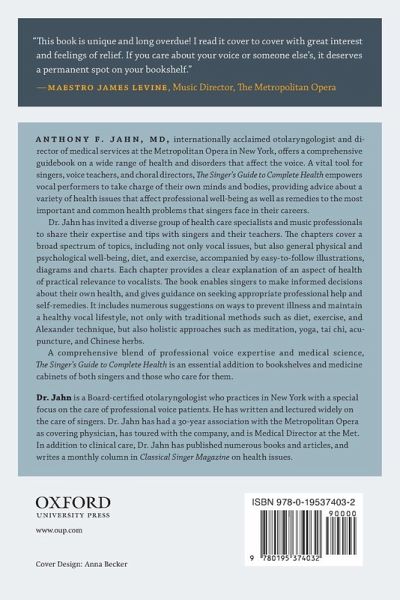 Anthony Jahn, M.D., internationally-acclaimed for his work as an opera doctor with some of the most prestigious opera companies in the world, brings together some of the profession's greatest doctors, performers, and instructors in a thorough and comprehensible guidebook on all aspects of health and disease that affect the voice.Anthony F. Jahn, MD, internationally acclaimed otolaryngologist and Director of Medical Services at the Metropolitan Opera in New York, offers a comprehensive guidebook on a wide range of health and disorders that affect the voice. A vital tool for singers, voice teachers, and choral directors, The Singer's Guide to Complete Health empowers vocal performers to take charge of their own minds and bodies, providing advice about a variety of health issues that affect professional well-being as well as remedies to the most important and common health problems that singers face in their careers.