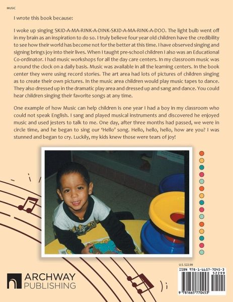 I wrote this book because: I woke up singing SKID-A-MA-RINK-A-DINK-SKID-A-MA-RINK-A-DOO. The light bulb went off in my brain as an inspiration to do so. I truly believe four year old children have the credibility to see how their world has become not for the better at this time. I have observed singing and signing brings joy into their lives. When I taught pre-school children I also was an Educational Co-ordinator. I had music workshops for all the day care centers. In my classroom music was a round the clock on a daily basis. Music was available in all the learning centers. In the book center they were using record stories. The art area had lots of pictures of children singing as to create their own pictures. In the music area children would play music tapes to dance. They also dressed up in the dramatic play area and dressed up and sang and dance. You could hear children singing their favorite songs at any time. One example of how Music can help children is one year I had a boy in my classroom who could not speak English. I sang and played musical instruments and discovered he enjoyed music and used jesters to talk to me. One day, after three months had passed, we were in circle time, and he began to sing our 'Hello' song. Hello, hello, hello, how are you? I was stunned and began to cry. Luckily, my kids knew those were tears of joy!
