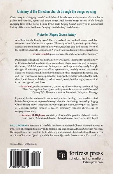Christianity is a "singing church," with biblical foundations and centuries of examples in the Psalms and canticles, favorite hymns, and gospel songs. And this singing church has a history. Through engaging tales of the stories behind this music and its authors, Rorem makes church history come alive. Singing Church History journeys through an ecumenical history of church music from early and medieval times through the Reformation and the early modern world, into American and World Christianity. Throughout, Rorem shows us how these familiar hymn texts have us "singing church history" on Sunday mornings without even knowing it. Rorem's analysis of well-known hymns from diverse strains of Christianity makes Singing Church History a useful resource for students, congregations, and curious readers. Placing familiar music from Roman Catholic, Orthodox, Lutheran, Pietist, Methodist, American evangelical, historically Black, and Christian communities around the world into historical context helps us appreciate the ecumenical nature of our musical traditions. Singing Church History includes hymn texts for easy reference.