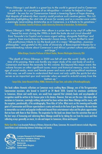 This book collates thematic reflections on Cameroon music exalting Manu Dibango, one of the first-generation Cameroonian musicians, who bowed to Covid-19 on 24 March 2020. Granted his enormous contribution to Cameroon, African and world music, one would have expected that scholarly books and encyclopaedia of recognition would be written in his honour prior to his demise. However, that was not the case. Like many other musicians in Cameroon, seemingly nothing substantial has been written about Manu Dibango and his music, with the exception, paradoxically, of his autobiography, Three Kilos of Coffee. What exists on this towering and humble giant of Cameroonian and African superstardom is scanty and mostly in the form of grey literature. We must learn to immortalise our artists and popular intellectuals beyond their entertainment value and the photo opportunities that we have with them in their lifetime. The inspiration for this book was drawn from the conviction that one of the best ways of honouring and valorising Manu Dibango would be by taking the cue from his music and then collecting essays generally on music, its role and impact in Cameroon, Africa and beyond.