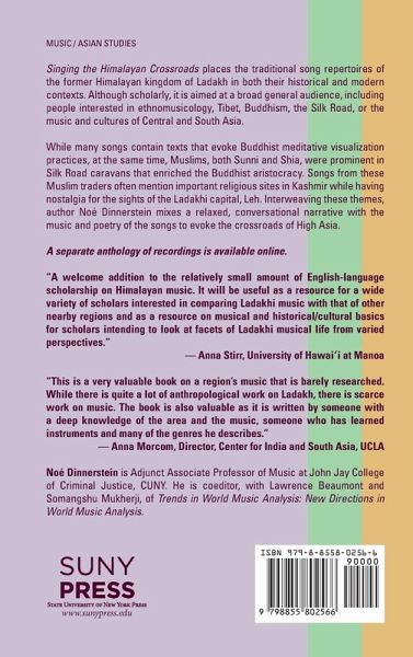Introduces the traditional songs of Himalayan Ladakh through their history, ethnology, poetry, and Tibetan Buddhism beliefs. Singing the Himalayan Crossroads places the traditional song repertoires of the former Himalayan kingdom of Ladakh in both their historical and modern contexts. Although scholarly, it is aimed at a broad general audience, including people interested in ethnomusicology, Tibet, Buddhism, the Silk Road, or the music and cultures of Central and South Asia. While many songs contain texts that evoke Buddhist meditative visualization practices, at the same time, Muslims, both Sunni and Shia, were prominent in Silk Road caravans that enriched the Buddhist aristocracy. Songs from these Muslim traders often mention important religious sites in Kashmir while having nostalgia for the sights of the Ladakhi capital, Leh. Interweaving these themes, author Noé Dinnerstein mixes a relaxed, conversational narrative with the music and poetry of the songs to evoke the crossroads of High Asia. A separate anthology of recordings is available online.