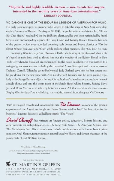 Vic Damone is one of the enduring legends of American pop music. His early days were spent as an usher who longed to take the stage at New York City's legendary Paramount Theater. On August 30, 1947, he got his wish when his first hit "I Have But One Heart" reached #7 on the Billboard Chart. Befriended by Frank Sinatra and encouraged by legends like Perry Como and Tommy Dorsey, Damone had one of the greatest voices ever recorded covering such Lerner and Loewe classics as "On the Street Where You Live" and "Gigi" while making other numbers, like "You Do", his own. In "Singing Was the Easy Part", Damone tells the whole story of his life - and what a life it's been! A mob boss tried to throw him out the window of the Edison Hotel in New York City when he broke off an engagement to the boss's daughter. He was married to a string of glamorous women including the beautiful Anna Pierangeli and the tempestuous Diahann Carroll. When he got to Hollywood, Judy Garland gave him his first screen test, he got drunk for the first time with Ava Gardner at Chasens and he went golfing regularly with George Burns and Jack Benny. Oh yeah, there's also the story about how he took a nude chorus girl into the steam room of the Sands Hotel where Sinatra, Sammy Davis Jr. and Dean Martin were relaxing between shows. All that - and much more - makes "Singing Was the Easy Part" a rollicking star-studded memoir from the great Vic Damone.