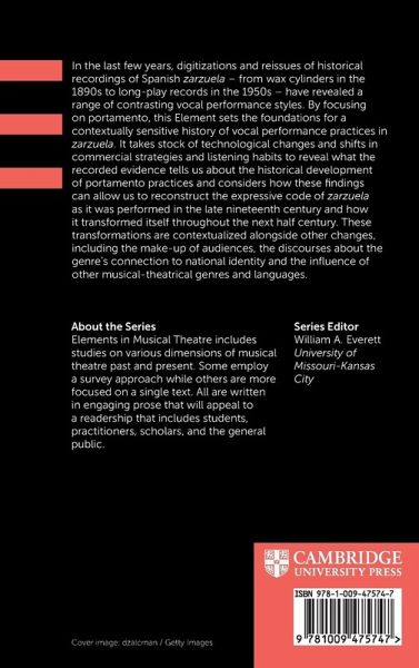 By focusing on portamento, this Element sets the foundations for a sensitive history of vocal performance practices in zarzuela. It tells us about the transformation of the expressive code of zarzuela. Other changes include the make-up of audiences, the discourses about the genre's connection, and the influence of other genres and languages.
