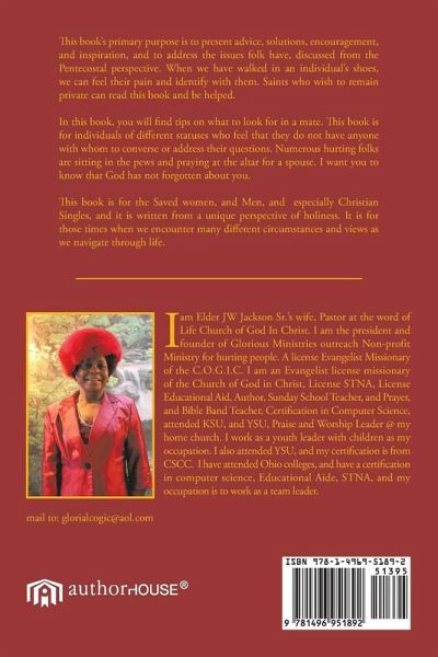 This book's primary purpose is to present advice, solutions, encouragement, and inspiration, and to address the issues folk have, discussed from the Pentecostal perspective. When we have walked in an individual's shoes, we can feel their pain and identify with them. Saints who wish to remain private can read this book and be helped. In this book, you will find tips on what to look for in a mate. This book is for individuals of different statuses who feel that they do not have anyone with whom to converse or address their questions. Numerous hurting folks are sitting in the pews and praying at the altar for a spouse. I want you to know that God has not forgotten about you. This book is for the minister's wife and Christian singles, and it is written from a unique perspective of holiness. It is for those times when we encounter many different circumstances and views as we navigate through life.