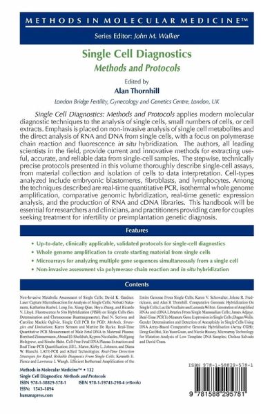 The aim of Single Cell Diagnostics: Methods and Protocols is for all readers to extend their knowledge and expertise in analysis of single cells. The book starts with laser assisted cell collection, non-invasive assessment of single cells and moves through the techniques of standard fluorescence in situ hybridization and polymerase chain reaction (PCR) As the reader moves through the book, the scope and complexity of each technique gradually increases as real-time quantitative PCR, isothermal whole genome amplification, comparative genomic hybridization, real-time gene expression analysis and the production of RNA and cDNA libraries are covered. The book closes with the application of customized microarrays to the study of single cells.