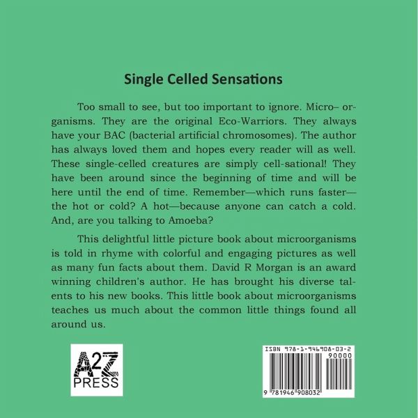 A 32 page children's picture book about microorganisms that is told in rhyme and has colorful pictures as well as fun facts about bacteria/fungi/plankton/protozoa and more. Our world is filled with organisms that cannot be seen with the human eye. David R Morgan is an award winning author who brings his teaching talents to his new books that entertain, engage, and teach young readers about living organisms all around us.