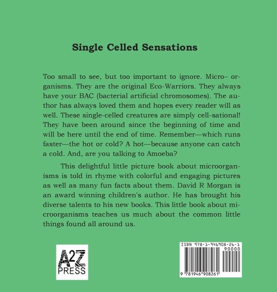 A 32 page children's picture book about microorganisms that is told in rhyme and has colorful pictures as well as fun facts about bacteria/fungi/plankton/protozoa and more. Our world is filled with organisms that cannot be seen with the human eye. David R Morgan is an award winning author who brings his teaching talents to his new books that entertain, engage, and teach young readers about living organisms all around us.
