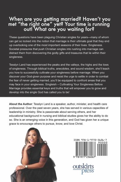 When are you getting married? You haven't met "the right one" yet? Your time is running out? What are you waiting for? These have been questions plaguing many Christian singles for years. Many Christian singles can get so locked into the notion that marriage is the ultimate goal in their lifetime that they end up overlooking one of the most important seasons of their lives. Singleness. Societal pressures that often bombard Christian singles to rush into marriage can steal their attention from discovering the godly gift and treasure that lie within their singleness. Through her journey as a single, Tesslyn Land has experienced the peaks, the valleys, the highs and the lows of singleness. Through biblical truths, personal stories and sound wisdom, Tesslyn teaches you how to successfully cultivate your singleness before marriage. By teaching you how to discover your God-given purpose as a single to resisting he urge to settle to combatting the fear of never getting married, she equips you to confront areas that you may be faced in your singleness. She passionately provides essential keys and truths that will empower you to grow and develop into the single that God has called you to be.