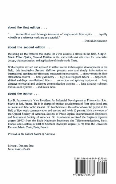 A basic, unified reference, rather than a description of the current experimental activity, presenting the scientific and engineering principles of single-mode optical fibers. It does, however, update discussions to reflect developments since the 1983 first edition, particularly those spurred by the