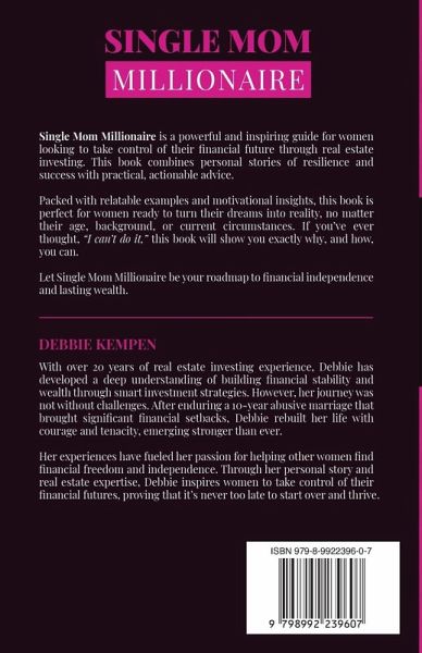 Single Mom Millionaire is a powerful and inspiring guide for women looking to take control of their financial future through real estate investing. This book combines personal stories of resilience and success with practical, actionable advice. Packed with relatable examples and motivational insights, this book is perfect for women ready to turn their dreams into reality, no matter their age, background, or current circumstances. If you've ever thought, "I can't do it," this book will show you exactly why - and how - you can. Let Single Mom Millionaire be your roadmap to financial independence and lasting wealth.