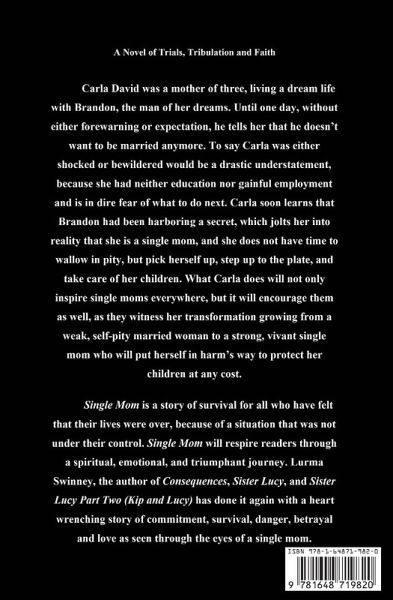 Carla David was a mother of three, living a dream life with Brandon, the man of her dreams. Until one day, without either forewarning or expectation, he tells her that he doesn't want to be married anymore. To say Carla was either shocked or bewildered would be a drastic understatement, because she had neither education nor gainful employment and is in dire fear of what to do next. Carla soon learns that Brandon had been harboring a secret, which jolts her into reality that she is a single mom, and she does not have time to wallow in pity, but pick herself up, step up to the plate, and take care of her children. What Carla does will not only inspire single moms everywhere, but it will encourage them as well, as they witness her transformation growing from a weak, self-pity married woman to a strong, vivant single mom who will put herself in harms way to protect her children at any cost. Single Mom is a story of survival for all who have felt that their lives were over, because of a situation that was not under their control. Single Mom will respire readers through a spiritual, emotional, and triumphant journey. Lurma Swinney, the author of Consequences, Sister Lucy, and Sister Lucy Part Two (Kip and Lucy) has done it again with a heart wrenching story of commitment, survival, danger, betrayal and love as seen through the eyes of a single mom.