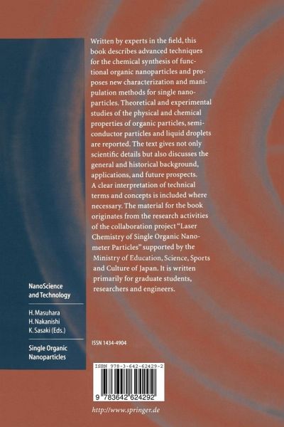This book summarizes recent scientific results on organic nanoparticles in view of the observation, measurement, and manipulation of single particles. This approach makes it possible to extract the nature of organic nanopar ticles without considering the averaged information ofthe nanoparticles over distributions of size, shape, inner structure, and environment. It is based on recent progress in laser, microscope, and optical detection systems. Various kinds of new methodology, theory, analysis, and preparation of organic na noparticles have been developed and applied. Novel phenomena, properties, characteristics, and functionality have been explored and revealed. Such stu dies on the chemistry and physics ofnanoparticles is bridging our gaps in the understanding of single molecules, atoms, and bulk materials. Molecular pictures are particularly useful for predicting, explaining, and designing the the physical and chemical properties of organic nanoparticles. This is especially the case in light of the availability of more than 15 million kinds of molecules for synthesis. This approach is opening new aspects of nanoscience and nanotechnology which can never be attained by studies on nanoparticles of metals and semiconductors.