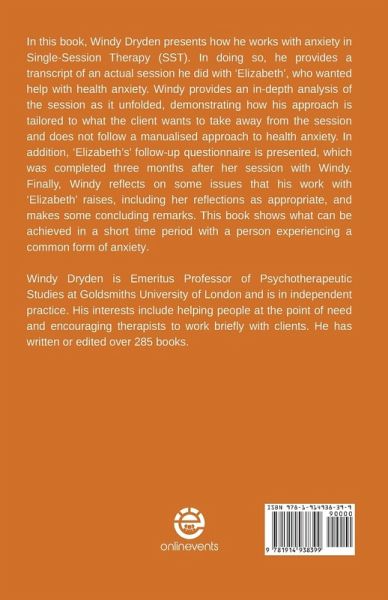 In this book, Windy Dryden presents how he works with anxiety in Single-Session Therapy (SST). In doing so, he provides a transcript of an actual session he did with 'Elizabeth', who wanted help with health anxiety. Windy provides an in-depth analysis of the session as it unfolded, demonstrating how his approach is tailored to what the client wants to take away from the session and does not follow a manualised approach to health anxiety. In addition, 'Elizabeth's' follow-up questionnaire is presented, which was completed three months after her session with Windy. Finally, Windy reflects on some issues that his work with 'Elizabeth' raises, including her reflections as appropriate, and makes some concluding remarks. This book shows what can be achieved in a short time period with a person experiencing a common form of anxiety. Windy Dryden is Emeritus Professor of Psychotherapeutic Studies at Goldsmiths University of London and is in independent practice. His interests include helping people at the point of need and encouraging therapists to work briefly with clients. He has written or edited over 285 books.