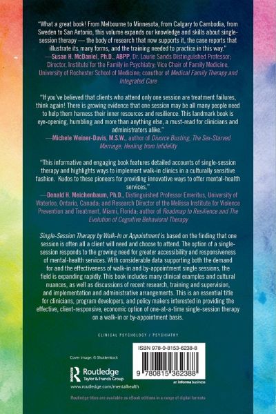 Single-Session Therapy by Walk-in or Appointment is based on the idea that one session is often all a client will need and choose to attend. The option of a single-session responds to the growing need for greater accessibility and responsiveness of mental-health services.¿ With considerable data supporting both the demand for and the effectiveness of walk-in and by-appointment single sessions, the field is expanding rapidly. This book includes many clinical examples and cultural nuances, as well as discussions of recent research, training and supervision, and implementation and administrative arrangements. This is an essential title for clinicians, program developers, and policy makers interested in providing the effective, client-responsive, economic option of one-at-a-time single-session therapy on a walk-in or by-appointment basis.¿¿¿
