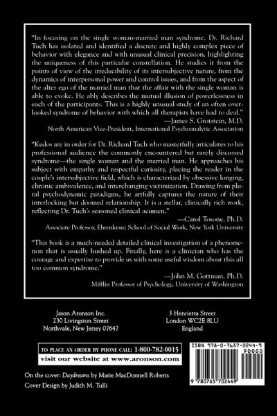 Many single woman-married man relationships are characterized by such recognizable, even stereotypic, interactions and run such a predictable course as to constitute a genuine syndrome. Documenting the existence of this syndrome with case histories from inside and outside clinical practice, Dr. Tuch gives serious consideration to the complex dynamics involved and offers a framework to help patients struggling with their involvement in such affairs. A broader discussion of relations between men and women evolves and addresses such issues as men's dread of women; women's unique inclinations to employ masochistic adaptations in their relations with men; married couples' varied styles of dealing with their differences; the relationship of power and control to the processes of domination, submission, and the act of surrendering; and the development of the capacity to fall and remain in love.