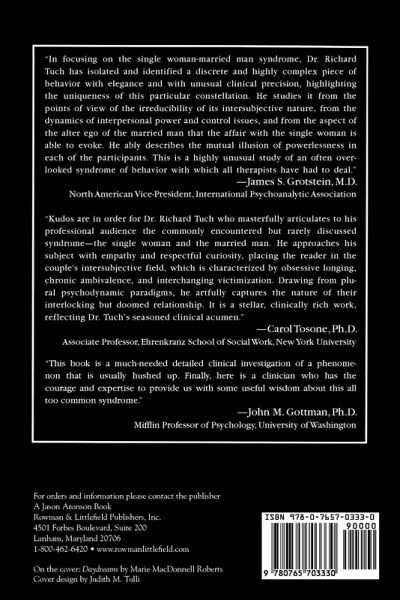Many single woman-married man relationships are characterized by such recognizable, even stereotypic, interactions and run such a predictable course as to constitute a genuine syndrome. Documenting the existence of this syndrome with case histories from inside and outside clinical practice, Dr. Tuch gives serious consideration to the complex dynamics involved and offers a framework to help patients struggling with their involvement in such affairs. A broader discussion of relations between men and women evolves and addresses such issues as men's dread of women; women's unique inclinations to employ masochistic adaptations in their relations with men; married couples' varied styles of dealing with their differences; the relationship of power and control to the processes of domination, submission, and the act of surrendering; and the development of the capacity to fall and remain in love.