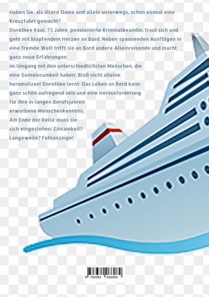 Haben Sie, als ältere Dame und allein unterwegs, schon einmal eine Kreuzfahrt gemacht? Dorothee Kaul, 73 Jahre, pensionierte Kriminalbeamtin, traut sich und geht mit klopfendem Herzen an Bord. Neben spannenden Ausflügen in eine fremde Welt trifft sie an Bord andere Alleinreisende und macht ganz neue Erfahrungen im Umgang mit den unterschiedlichsten Menschen, die eine Gemeinsamkeit haben: Bloß nicht alleine herumsitzen! Dorothee lernt: Das Leben an Bord kann ganz schön aufregend sein und eine Herausforderung für ihre in langen Berufsjahren erworbene Menschenkenntnis.Am Ende der Reise muss sie sich eingestehen: Einsamkeit? Langeweile? Fehlanzeige!