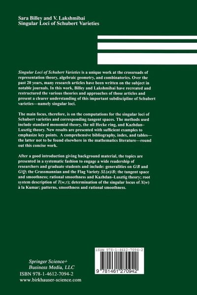 "Singular Loci of Schubert Varieties" is a unique work at the crossroads of representation theory, algebraic geometry, and combinatorics. Over the past 20 years, many research articles have been written on the subject in notable journals. In this work, Billey and Lakshmibai have recreated and restructured the various theories and approaches of those articles and present a clearer understanding of this important subdiscipline of Schubert varieties - namely singular loci. The main focus, therefore, is on the computations for the singular loci of Schubert varieties and corresponding tangent spaces. The methods used include standard monomial theory, the nil Hecke ring, and Kazhdan-Lusztig theory. New results are presented with sufficient examples to emphasize key points. A comprehensive bibliography, index, and tables - the latter not to be found elsewhere in the mathematics literature - round out this concise work. After a good introduction giving background material, the topicsare presented in a systematic fashion to engage a wide readership of researchers and graduate students.