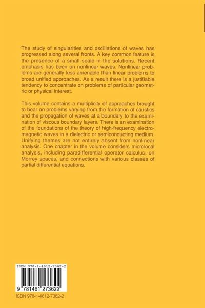 This IMA Volume in Mathematics and its Applications SINGULARITIES AND OSCILLATIONS is based on the proceedings of a very successful one-week workshop with the same title, which was an integral part of the 1994-1995 IMA program on "Waves and Scattering. " We would like to thank Joseph Keller, Jeffrey Rauch, and Michael Taylor for their excellent work as organizers of the meeting. We would like to express our further gratitude to Rauch and Taylor, who served as editors of the proceedings. We also take this opportunity to thank the National Science Foun dation (NSF), the Army Research Office (ARO) and the Office of Naval Research (ONR), whose financial support made the workshop possible. Avner Friedman Robert Gulliver v PREFACE Thestudyofsingularitiesand oscillationsofwaves has progressed along several fronts. A key common feature is the presence of a small scale in the solutions. Recent emphasis has been on nonlinear waves. Nonlinear problems are generally less amenable than linearproblems to broad unified approaches. As a result there is a justifiable tendency to concentrate on problems of particular geometric or physical interest. This volume con tains a multiplicity of approaches brought to bear on problems varying from the formation ofcaustics and the propagation ofwaves at a boundary to the examination ofviscous boundary layers. There is an examination of the foundations of the theory of high-frequency electromagnetic waves in a dielectric or semiconducting medium. Unifying themes are not entirely absent from nonlinear analysis.