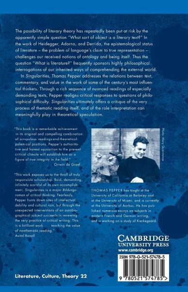 The possibility of literary theory has been repeatedly put at risk by the apparently simple question 'What is a literary text?' Throughout the twentieth century the epistemological status of literature, the problem of language's claim to true representation, has challenged our received notions of ontology and being. Thus the question 'What is literature?' has frequently sponsored highly philosophical interrogations of our inherited ways of comprehending the external world. In Singularities, Thomas Pepper addresses the relationship between textuality, value, and critical difficulty. In a rich sequence of nuanced close readings of especially demanding philosophical and literary texts, Singularities addresses key moments in Adorno, Blanchot, de Man, Derrida, Foucault, Althusser, Levinas and Celan. By offering a critique of the very process of thematic reading, this book addresses the whole question of truth and being, language and value, in a series of readings of sustained critical power.