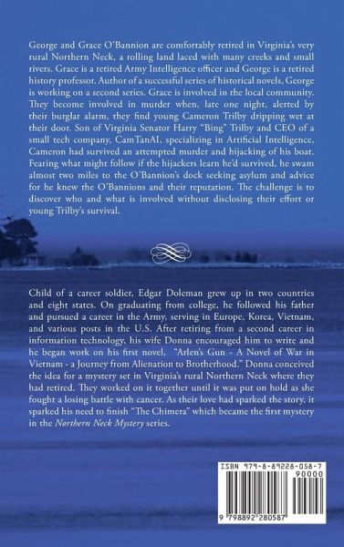 George and Grace O'Bannion are comfortably retired in Virginia's very rural Northern Neck, a rolling land laced with many creeks and small rivers. Grace is a retired Army Intelligence officer and George is a retired history professor. Author of a successful series of historical novels, George is working on a second series. Grace is involved in the local community. They become involved in murder when, late one night, alerted by their burglar alarm, they find young Cameron Trilby dripping wet at their door. Son of Virginia Senator Harry "Bing" Trilby and CEO of a small tech company, CamTanAI, specializing in Artificial Intelligence, Cameron had survived an attempted murder and hijacking of his boat. Fearing what might follow if the hijackers learn he'd survived, he swam almost two miles to the O'Bannion's dock seeking asylum and advice for he knew the O'Bannions and their reputation. The challenge is to discover who and what is involved without disclosing their effort or young Trilby's survival.