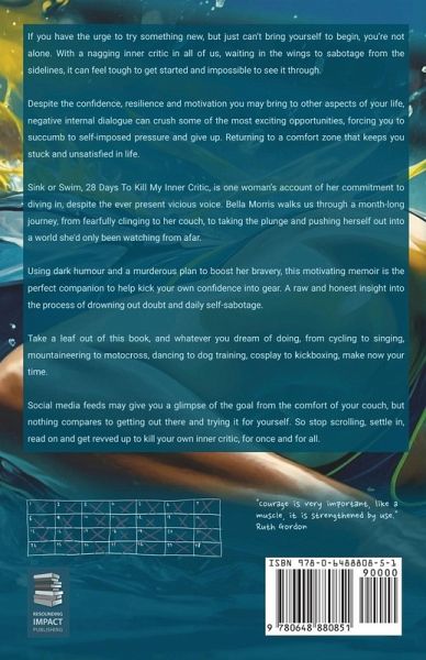 If you have the urge to try something new, but just can't bring yourself to begin, you're not alone. With a nagging inner critic in all of us, waiting in the wings to sabotage from the sidelines, it can feel tough to get started and impossible to see it through. Despite the confidence, resilience and motivation you may bring to other aspects of your life, negative internal dialogue can crush some of the most exciting opportunities, forcing you to succumb to self-imposed pressure and give up. Returning to a comfort zone that keeps you stuck and unsatisfied in life. Sink or Swim, 28 Days To Kill My Inner Critic, is one woman's account of her commitment to diving in, despite the ever present vicious voice. Bella Morris walks us through a month-long journey, from fearfully clinging to her couch, to taking the plunge and pushing herself out into a world she'd only been watching from afar. Using dark humour and a murderous plan to boost her bravery, this motivating memoir is the perfect companion to help kick your own confidence into gear. A raw and honest insight into the process of drowning out doubt and daily self-sabotage. Take a leaf out of this book, and whatever you dream of doing, from cycling to singing, mountaineering to motocross, dancing to dog training, cosplay to kickboxing, make now your time. Social media feeds may give you a glimpse of the goal from the comfort of your couch, but nothing compares to getting out there and trying it for yourself. So stop scrolling, settle in, read on and get revved up to kill your own inner critic, for once and for all.
