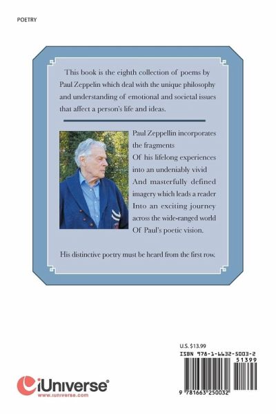 Paul Zeppellin incorporates the fragments Of his lifelong experiences into an undeniably vivid And masterfully defined imagery which leads a reader Into an exciting journey across the wide-ranged world Of Paul's poetic vision. His distinctive poetry must be heard from the first row.