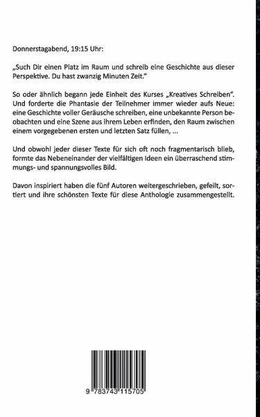 Donnerstagabend, 19:15 Uhr:"Such Dir einen Platz im Raum und schreib eine Geschichte aus dieser Perspektive. Du hast zwanzig Minuten Zeit."So oder ähnlich begann jede Einheit des Kurses "Kreatives Schreiben". Und forderte die Phantasie der Teilnehmer immer wieder aufs Neue: eine Geschichte voller Geräusche schreiben, eine unbekannte Person beobachten und eine Szene aus ihrem Leben erfinden, den Raum zwischen einem vorgegebenen ersten und letzten Satz füllen, ...Und obwohl jeder dieser Texte für sich oft noch fragmentarisch blieb, formte das Nebeneinander der vielfältigen Ideen ein überraschend stimmungs- und spannungsvolles Bild.Davon inspiriert haben die fünf Autoren weitergeschrieben, gefeilt, sortiert und ihre schönsten Texte für diese Anthologie zusammengestellt.