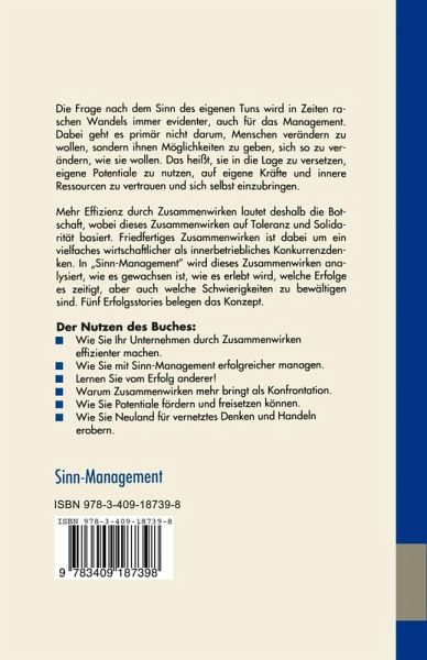 1. Vom Management zum Sinn-Management.- Drei Grenzen des klassischen Denkens.- Drei Stufen des systemischen Denkens.- Was ist Sinn?.- Was ist Sinn-Management?.- Die Dramaturgie des Buches.- Vorbilder.- 2. Vom Ich zum Wir.- Eine kleine Entdeckungsreise.- Neuronale Unternehmensorganisation?.- 3. Zusammenwirken - Praxis und Theorie.- Friedfertigkeit.- Gemeinnutzen durch Synergie.- Wirtschaftlichkeit.- Zwischenbilanz.- Gleichgewicht mit der Natur.- Gesundheit.- Sinn-Management ist Zusammenwirken.- 4. Einladung zum Abenteuer.- Das Einfädeln.- Die Sinnfrage.- Schritte machen.- Sehen, Riechen, Schmecken, Spüren, Hören.- Begegnungen.- Wegegabelungen.- Schwitzen.- Angst vor dem Absturz.- Grenzen überschreiten.- Schmerzen.- Glück.- Oben sein.- Abstiegsrausch.- Gewitter.- Ausklang.- Erschöpfung.- Gestaltungselemente.- 5. Einladung zum Mitwirken.- Widmung.- Literatur.- Autoren.- Stichwortverzeichnis.