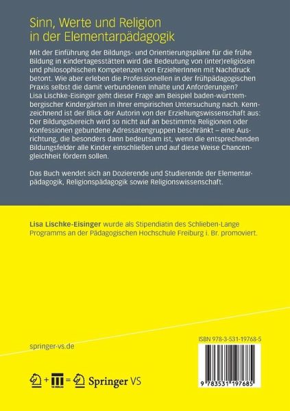 Ausgangssituation und gesellschaftliche Relevanz der Thematik.- Religion und Religionsfreiheit im Bereich der Elementarpädagogik.- Der Orientierungsplan und seine Bedeutung für die Auseinandersetzung mit weltanschaulichen und religiösen Inhalten in der Elementarpädagogik.- Die Bedeutung der ErzieherInnen im Kontext der Themen "Sinn, Werte und Religion".- Methodisches Design der empirischen Untersuchung.- Ergebnisse der empirischen Untersuchung.- Zusammenfassende Darstellung und zentrale Ergebnisse.- Ausblick.