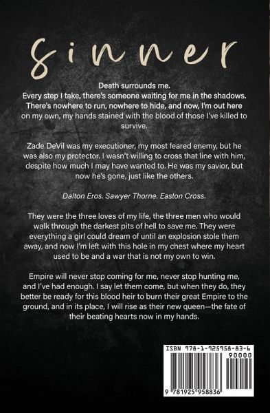 Death surrounds me. Every step I take, there's someone waiting for me in the shadows. There's nowhere to run, nowhere to hide, and now, I'm out here on my own, my hands stained with the blood of those I've killed to survive. Zade DeVil was my executioner, my most feared enemy, but he was also my protector. I wasn't willing to cross that line with him, despite how much I may have wanted to. He was my savior, but now he's gone, just like the others. Dalton Eros. Sawyer Thorne. Easton Cross. They were the three loves of my life, the three men who would walk through the darkest pits of hell to save me. They were everything a girl could dream of until an explosion stole them away, and now I'm left with this hole in my chest where my heart used to be and a war that is not my own to win. Empire will never stop coming for me, never stop hunting me, and I've had enough. I say let them come, but when they do, they better be ready for this blood heir to burn their great Empire to the ground, and in its place, I will rise as their new queen-the fate of their beating hearts now in my hands.