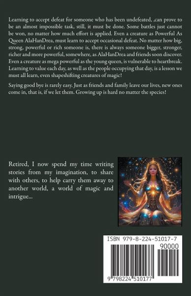 Learning to accept defeat for someone who has been undefeated, ,can prove to be an almost impossible task, still, it must be done. Some battles just cannot be won, no matter how much effort is applied. Even a creature as Powerful As Queen AlaHanDrea, must learn to accept occasional defeat. No matter how big, strong, powerful or rich someone is, there is always someone bigger, stronger, richer and more powerful, somewhere, as AlaHanDrea and friends soon discover. Even a creature as mega powerful as the young queen, is vulnerable to heartbreak. Learning to value each day, as well as the people occupying that day, is a lesson we must all learn, even shapeshifting creatures of magic! Saying good bye is rarely easy. Just as friends and family leave our lives, new ones come in, that is, if we let them. Growing up is hard no matter the species!