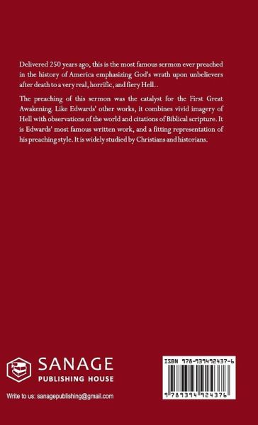 Delivered 250 years ago, this is the most famous sermon ever preached in the history of America emphasizing God's wrath upon unbelievers after death to a very real, horrific, and fiery Hell.. The preaching of this sermon was the catalyst for the First Great Awakening. Like Edwards' other works, it combines vivid imagery of Hell with observations of the world and citations of Biblical scripture. It is Edwards' most famous written work, and a fitting representation of his preaching style. It is widely studied by Christians and historians.