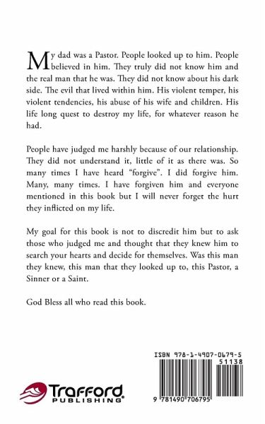 It tells of the trials, abuse, and wrong decisions I made throughout my life. How my dad, a pastor, really was behind the scenes. How he stopped at nothing to destroy me and my life.